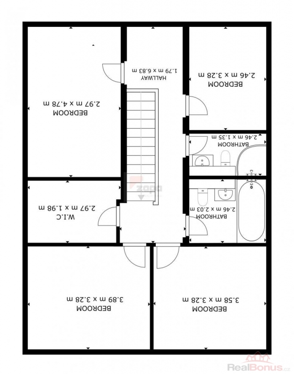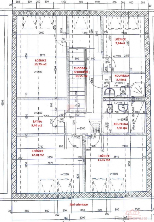 - 1.patro 72 m2- 4x samostatná ložnice, 1x šatna, 2x koupelna (vana, sprchový kout), 2x WC , vstup na půdu