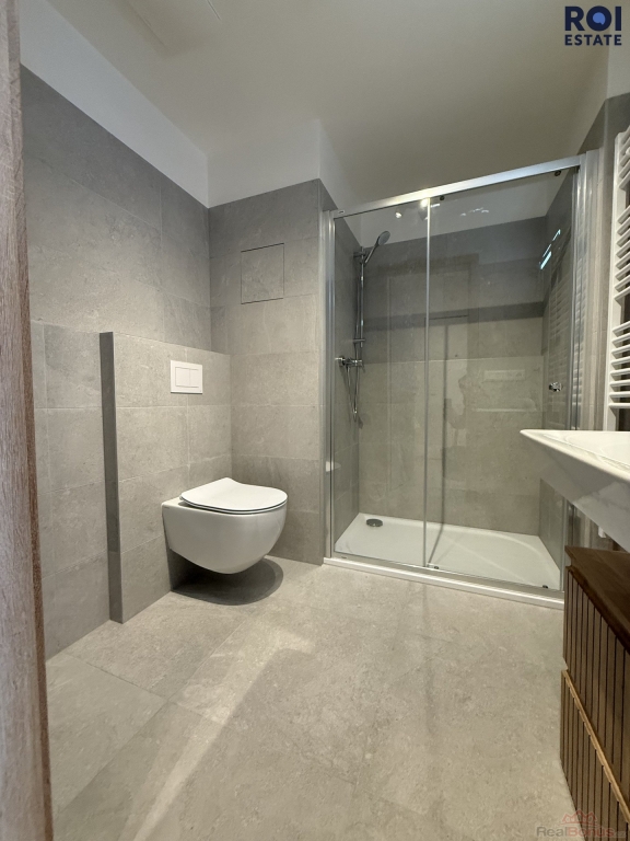 Koupelna se sprchovým koutem a WC.