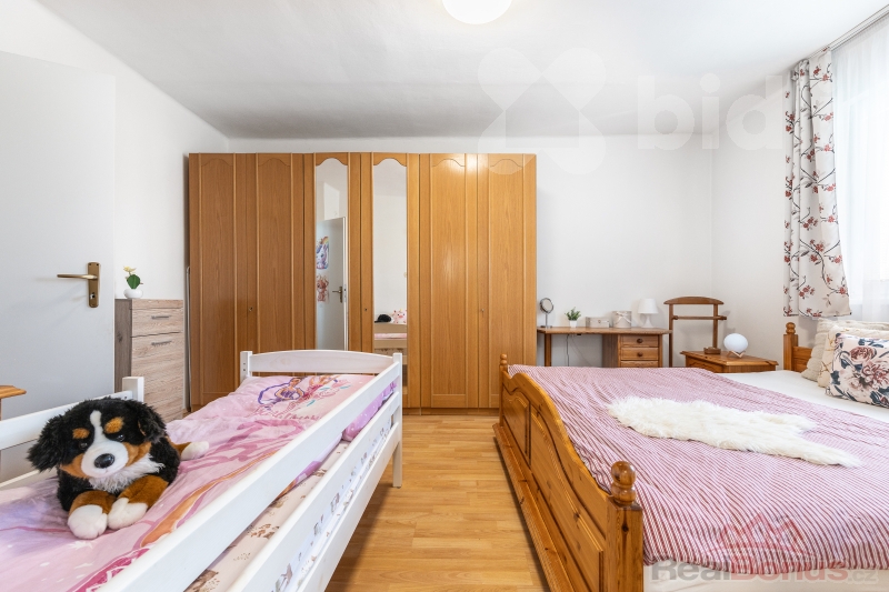 V přízemí najdete také ložnici a dětský pokoj. Tyto místnosti jsou vzájemně propojené, avšak dětský pokoj má i vlastní vstup z chodby, což zajišťuje flexibilitu využití.
