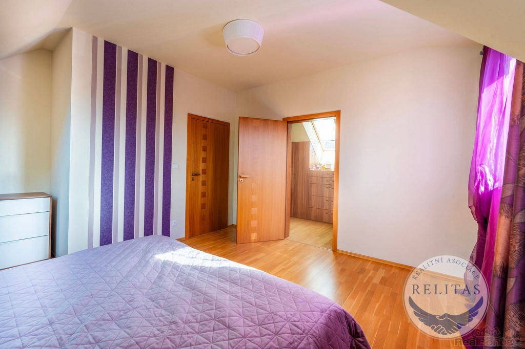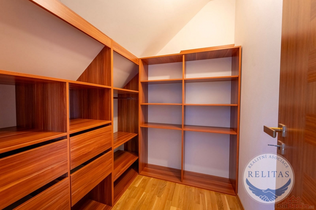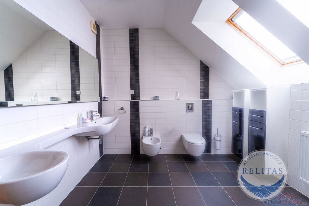 2. NP je řešeno jako klidová část domu, kde jsou umístěny tři ložnice s vlastními šatnami a tři koupelny. Dům je vytápěn plynovým kotlem.