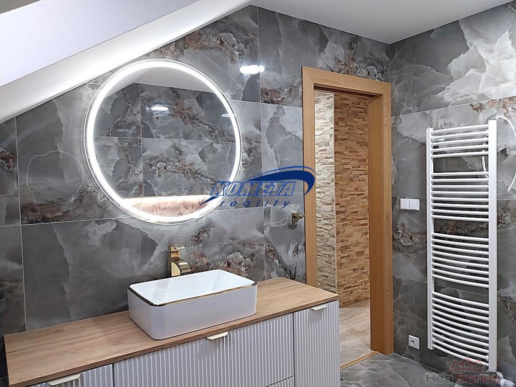 Byt má nové podlahy, dveře, sanitu a velkolepě řešenou koupelnu.