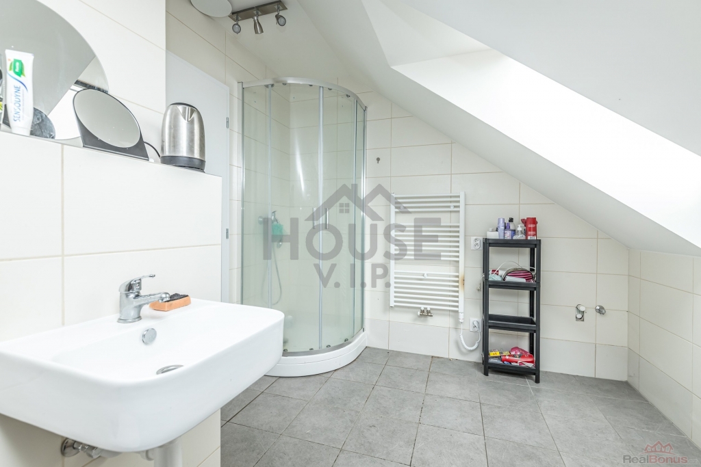v podkroví jsou dva pokoje, koupelna se sprchovým koutem a komora.
