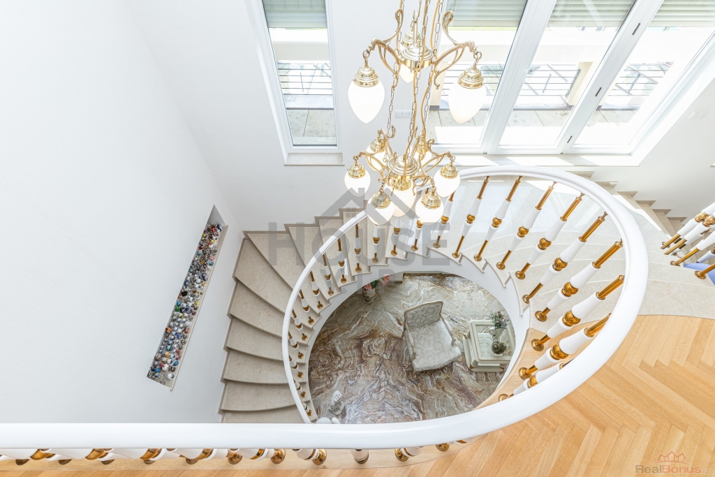 V přízemí domu se nachází velká vstupní hala se vstupem do prostorné šatny. Posuvnými inkrustovanými dveřmi se vchází do velké nádherné haly s mramorovým schodištěm do horního patra a přístupem do krásné zahrady, v obou místnostech jsou úžasné mramorové podlahy.