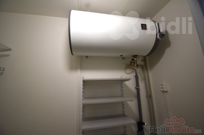 *Předsíň s praktickou technickou místností, kde se nachází bojler, prostor pro šatnu, přípojka na pračku se sušičkou a úložné regály