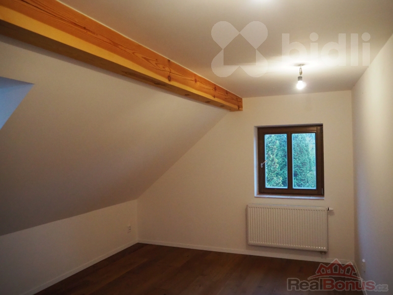 V patře jsou 4 samostatné ložnice, koupelna s vanou, sprchovým koutem a WC a úložný prostor na půdě.