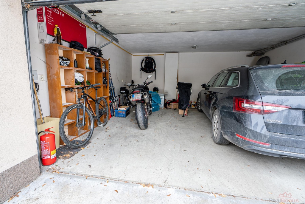 - K BYTU LZE PŘIKOUPIT POLOVINU dvojgaráže ve vnitrobloku domu (3 × 5,7 m, rolovací vrata, elektrické zásuvky, regál) cena 1.000.000 Kč