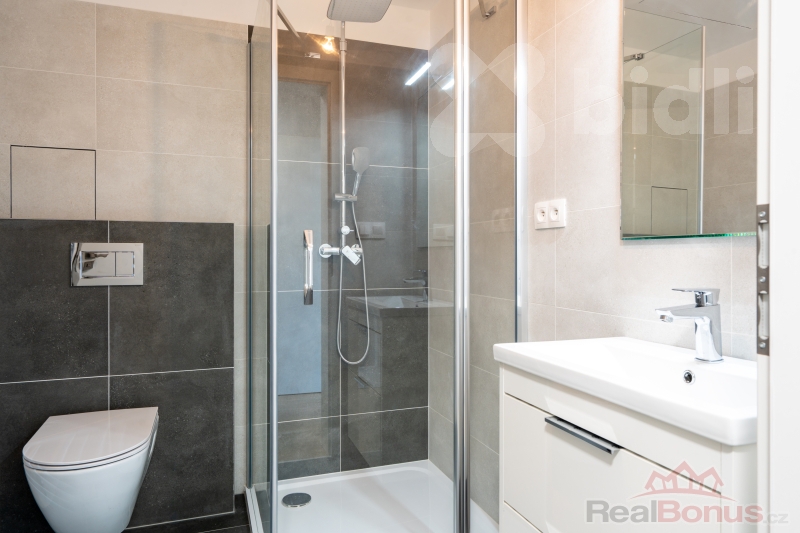 Koupelna (3,9 m2) se sprchovým koutem, s otopným žebříkem, s místem pro pračku a s toaletou.