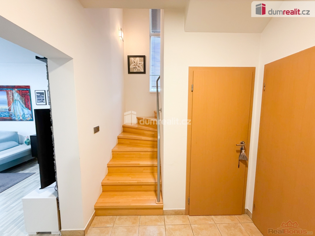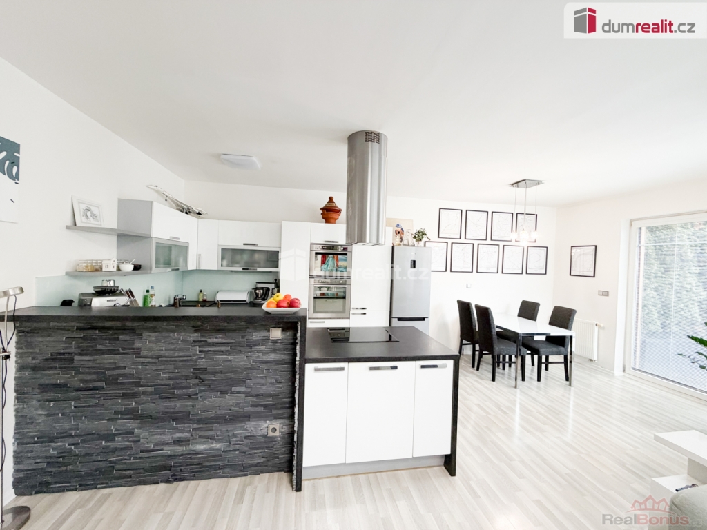 +popl. 5000, 1x kauce, 1x nájem, 1x provize RK, pronájem moderního rodinného domu, jedná se o polovinu dvojdomu o dispozici 5+kk v klidné rezidenční části Prahy, v ulici Za Sadem, Praha Březiněves. Dům je řešen jako polovina dvojdomu se samostatným vstupem, vlastní zahradou a garáží.