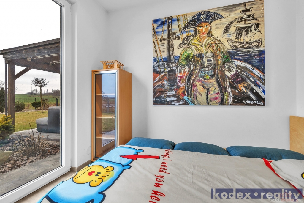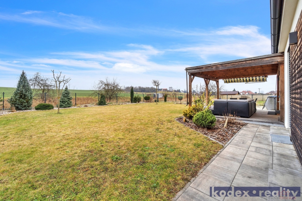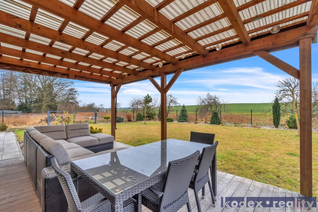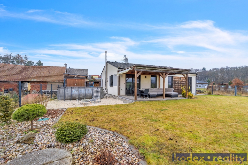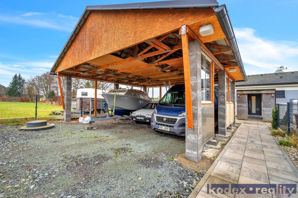 Dispozice: krytý vstup, zádveří s vestavěnou skříní a technickou místností, obytná místnost s kuchyňským koutem se spíží, chodba s přístupem na půdu, koupelna s vanou, sprchovým koutem a saunou, komora, ložnice, dětský pokoj a pracovna a krytá terasa. Vedle RD stojí dílna a sklad na kola, motorky apod. Před domem je postaveno velké garážové stání pro 2-3 auta včetně dodávky. Pozemek je kompéletně oplocen a vpředu je elektricky ovládaná vjezdová brána. Okrasná zahrada je vybavena zavlažovacím systémem, venkovní sprchou, bazeném a krytou terasou.