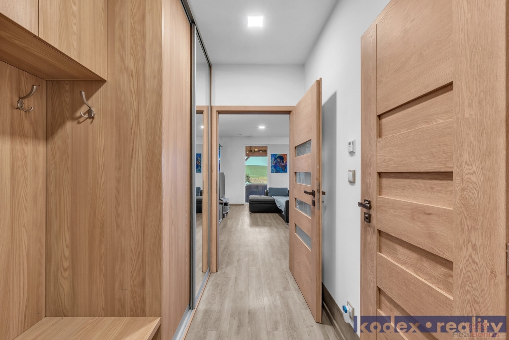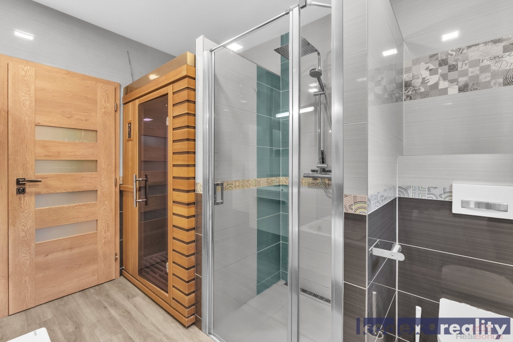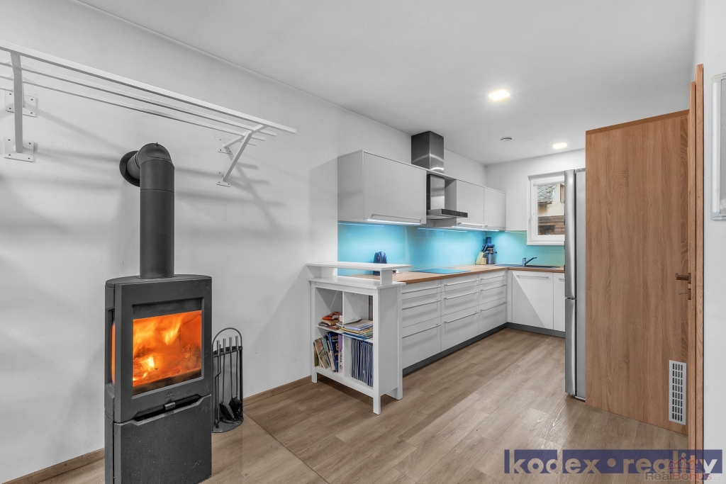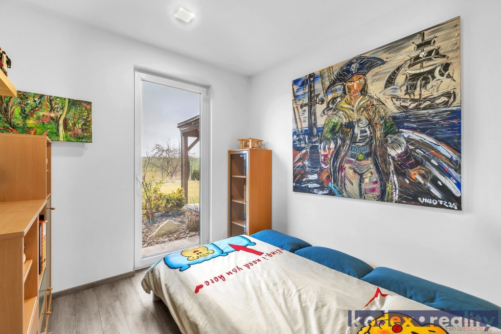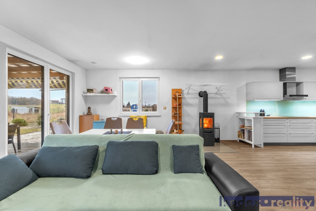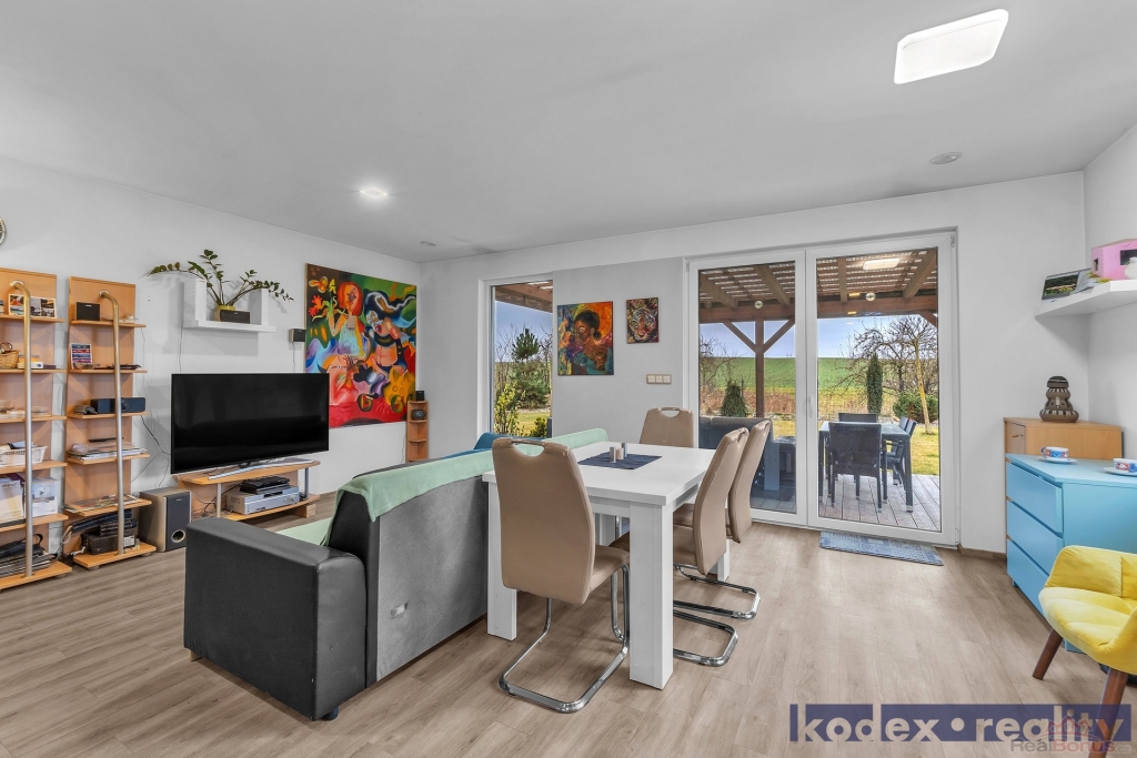 Dispozice: krytý vstup, zádveří s vestavěnou skříní a technickou místností, obytná místnost s kuchyňským koutem se spíží, chodba s přístupem na půdu, koupelna s vanou, sprchovým koutem a saunou, komora, ložnice, dětský pokoj a pracovna a krytá terasa. Vedle RD stojí dílna a sklad na kola, motorky apod. Před domem je postaveno velké garážové stání pro 2-3 auta včetně dodávky. Pozemek je kompéletně oplocen a vpředu je elektricky ovládaná vjezdová brána. Okrasná zahrada je vybavena zavlažovacím systémem, venkovní sprchou, bazeném a krytou terasou.