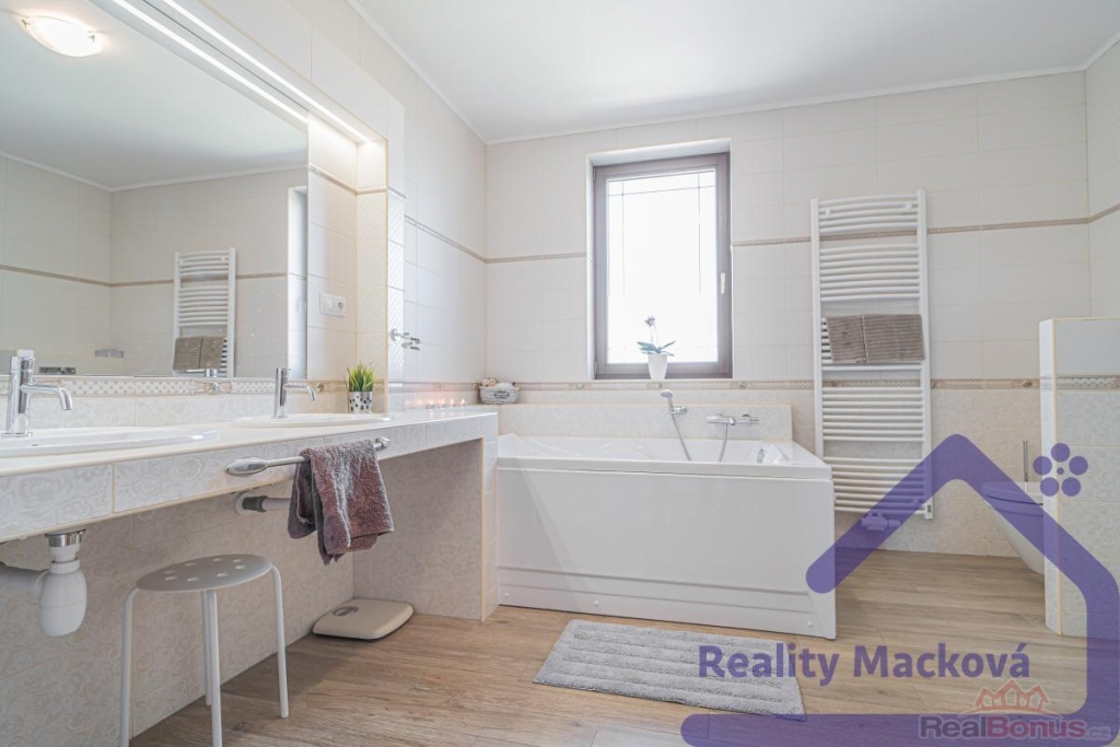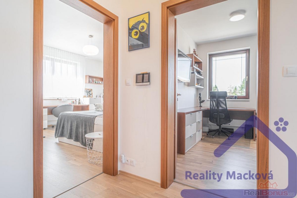 V patře má každý své soukromí. Dvě dětské ložnice, rodičovská ložnice se šatnou, pracovna a další multifunkční pokoj, který se snadno přizpůsobí vašemu životnímu stylu ať už jako druhá kancelář, pokoj pro hosty nebo klidná ložnice. Prostorná rodinná koupelna s vanou pro dva, sprchovým koutem a dvěma umyvadly je dostupná ze společné chodby.