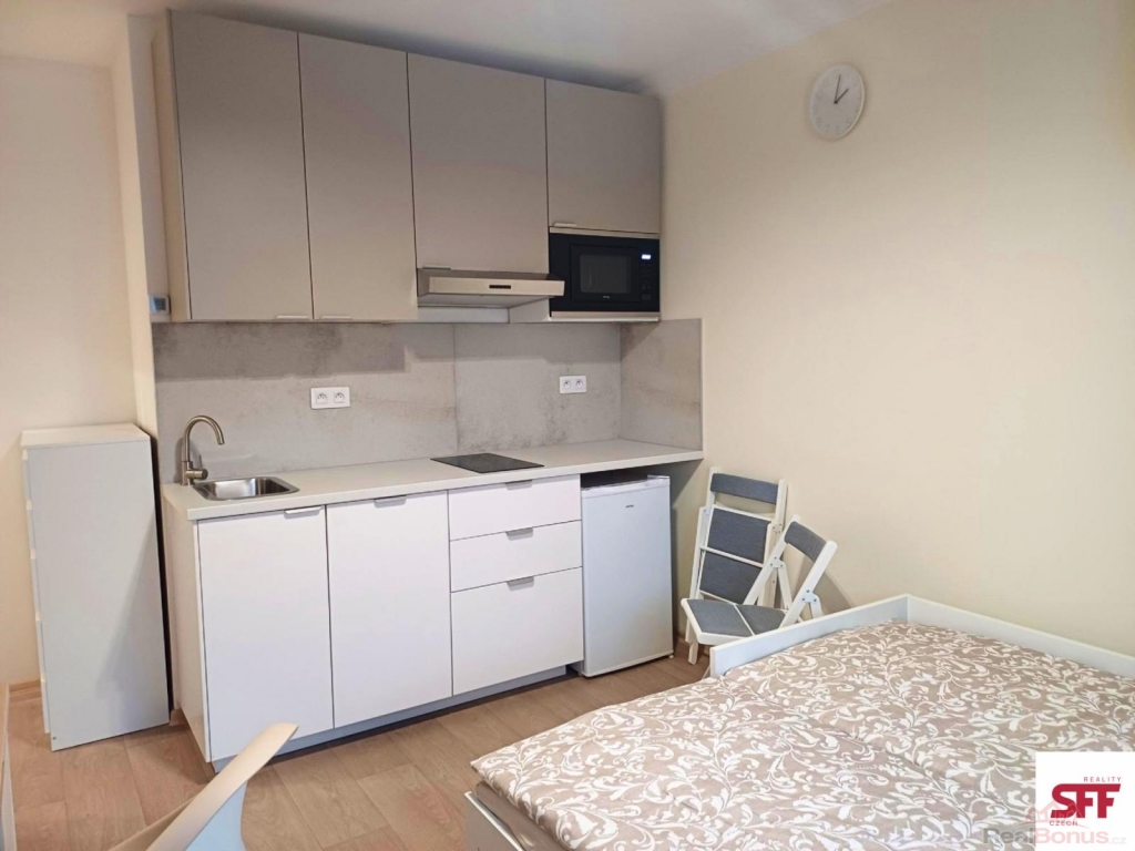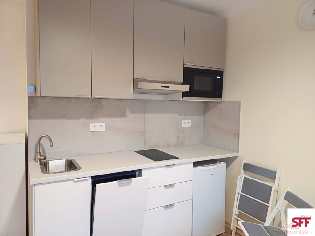 Byt je plně vybaven: Kuchyňská linka se spotřebiči (myčka, mikrovlnná trouba, varná deska, digestoř), jídelní stůl a židle, pracovní stůl a židle, rozkládací postel + 2 matrace (šířka po rozložení 160 cm x 200 cm), komoda a úložné prostory pro oblečení, botník, základní nádobí, lůžkoviny a povlečení a další drobné vybavení.