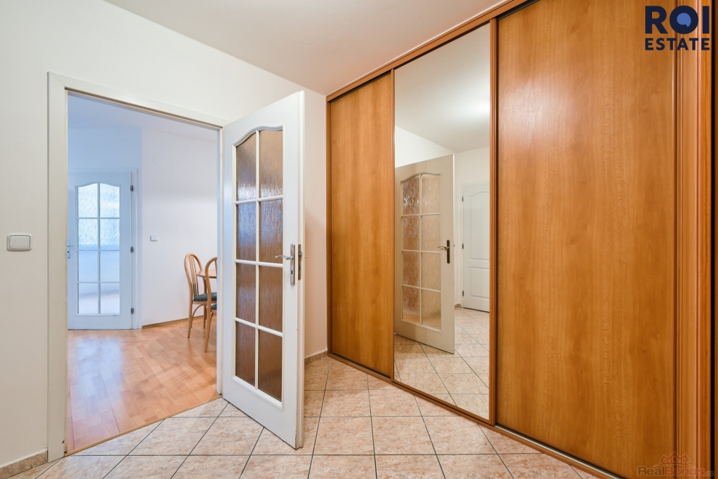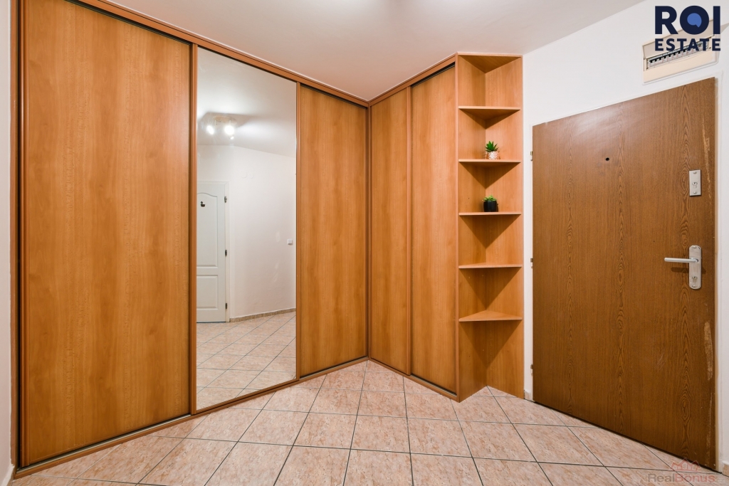 ? Předsíň: Prostorná rohová vestavěná skříň se zrcadlem pro dostatek úložného prostoru.
