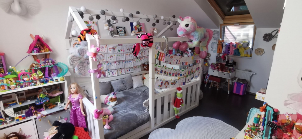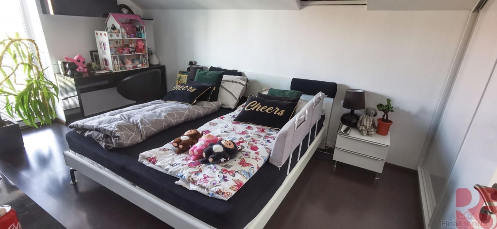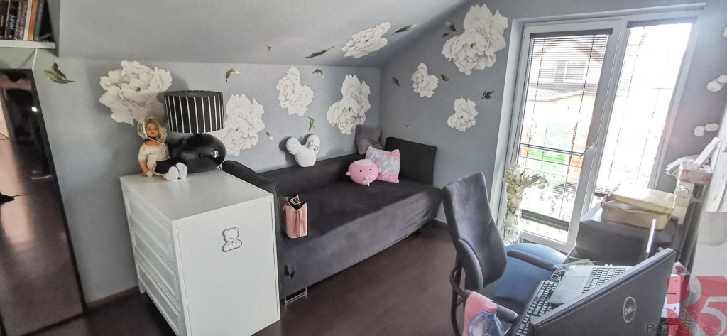 V prvním patře se nachází čtyři pokoje, které jsou nyní využívány jako ložnice, pracovna, dětský pokoj se šatnou a čtvrtý pokoj přestavěný na prostornou šatnu. Okna jsou vybavena venkovními elektrickými žaluziemi, včetně střešních, což zajišťuje soukromí, tepelnou pohodu a bezpečnost.
