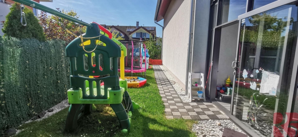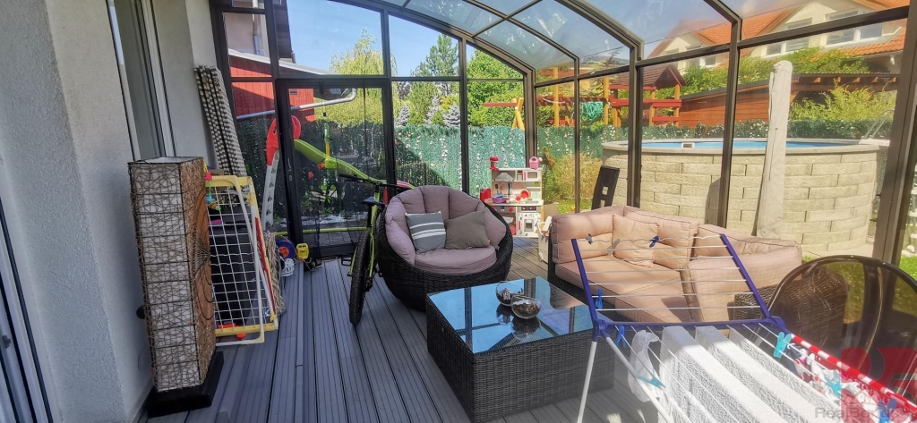 Za domem se nachází velký dřevěný domek a mnoho herních prvků pro děti, což z něj činí skvělé místo pro rodinné aktivity. Dále je zde vybudovaný zděný nadzemní bazén a zimní zahrada, která je ideální pro odpočinek.