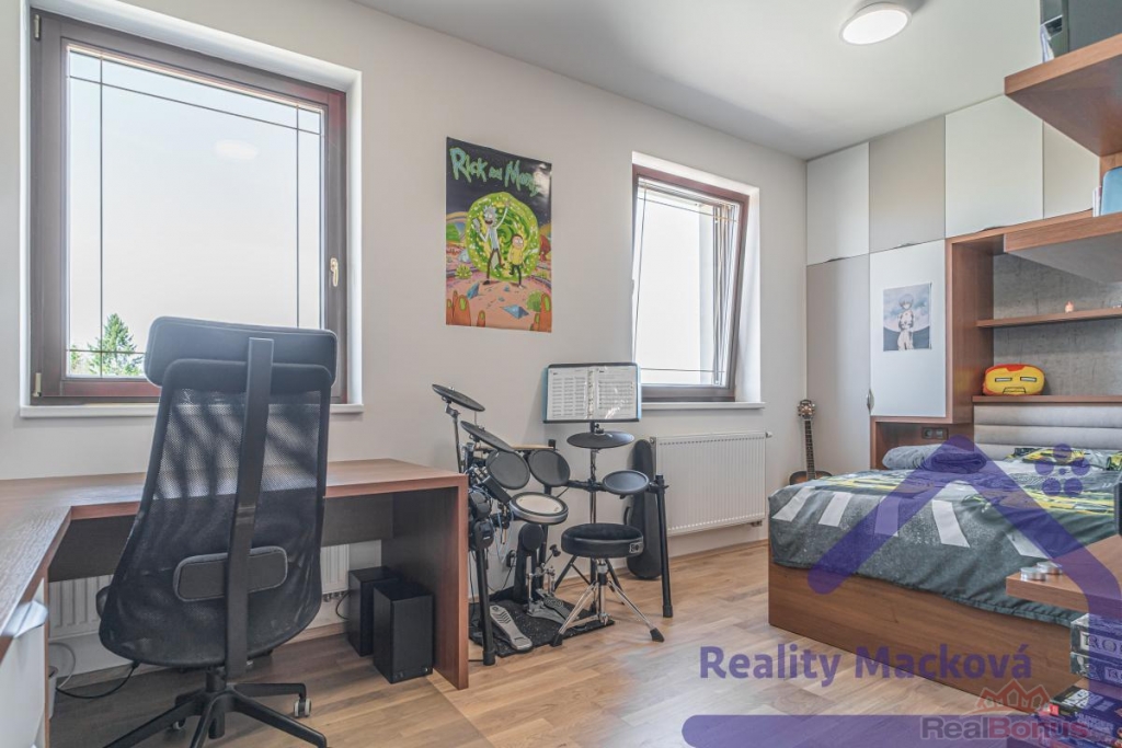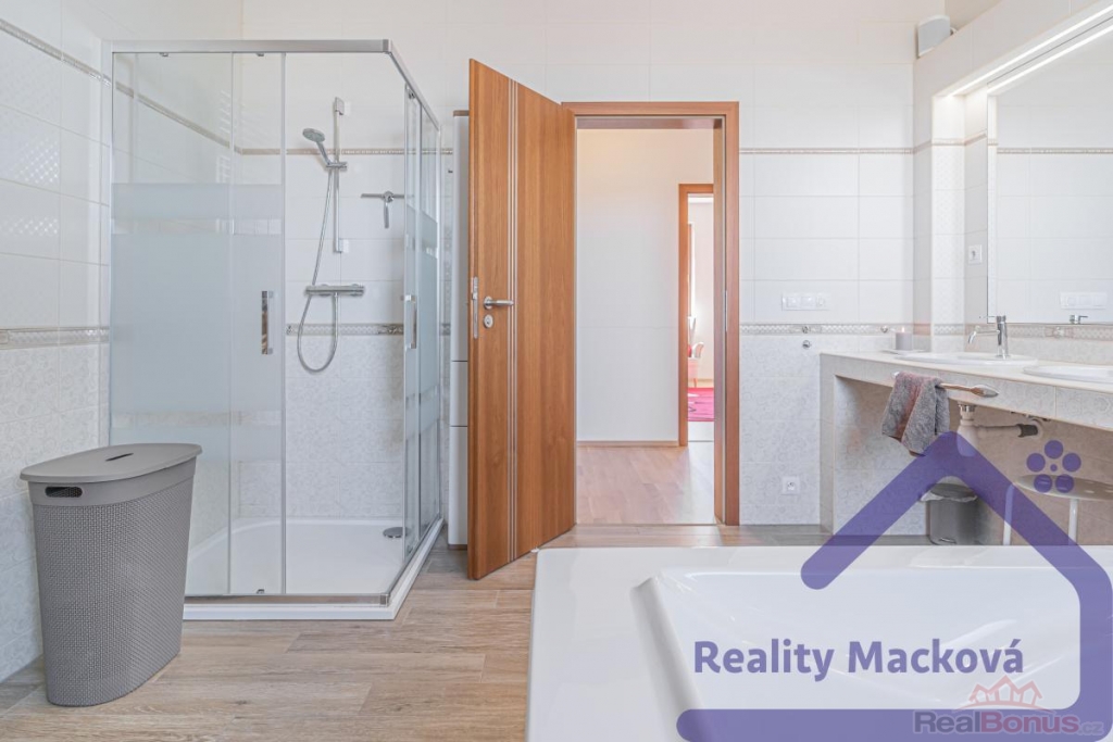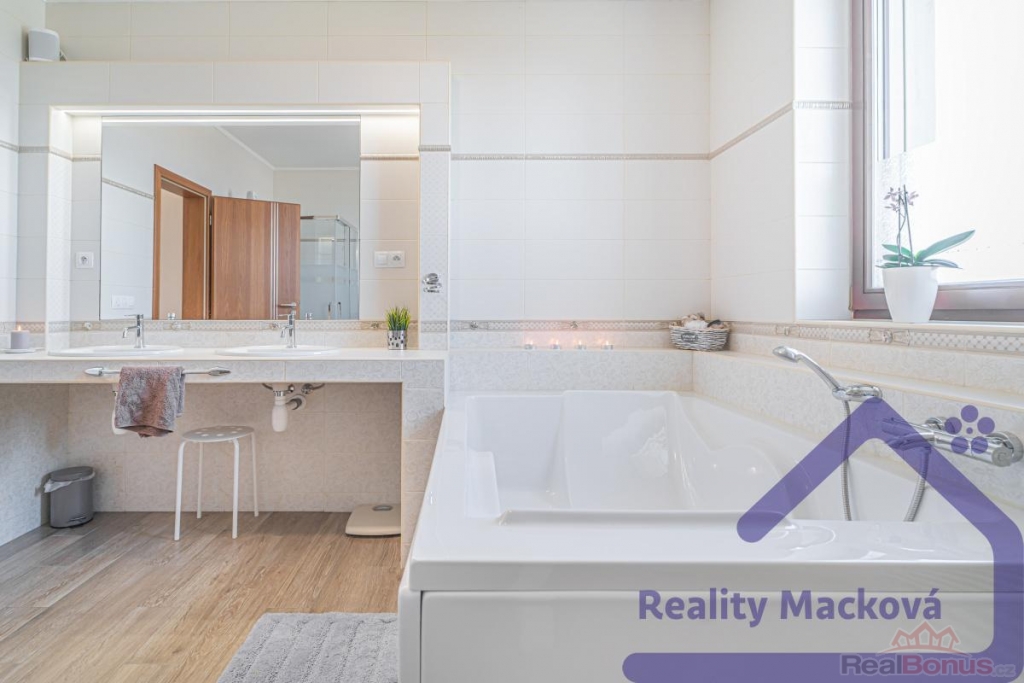 V patře se nachází dvě dětské ložnice, hlavní, rodičovská ložnice s vlastní šatnou, prostorná pracovna a ještě další pokoj, který může sloužit jako pokoj pro hosty, teenagery nebo domácí studio. Koupelna je prostorná a nabízí obrovskou vanu, sprchový kout i dvě umyvadla, což ocení zejména rodiny při ranním shonu.