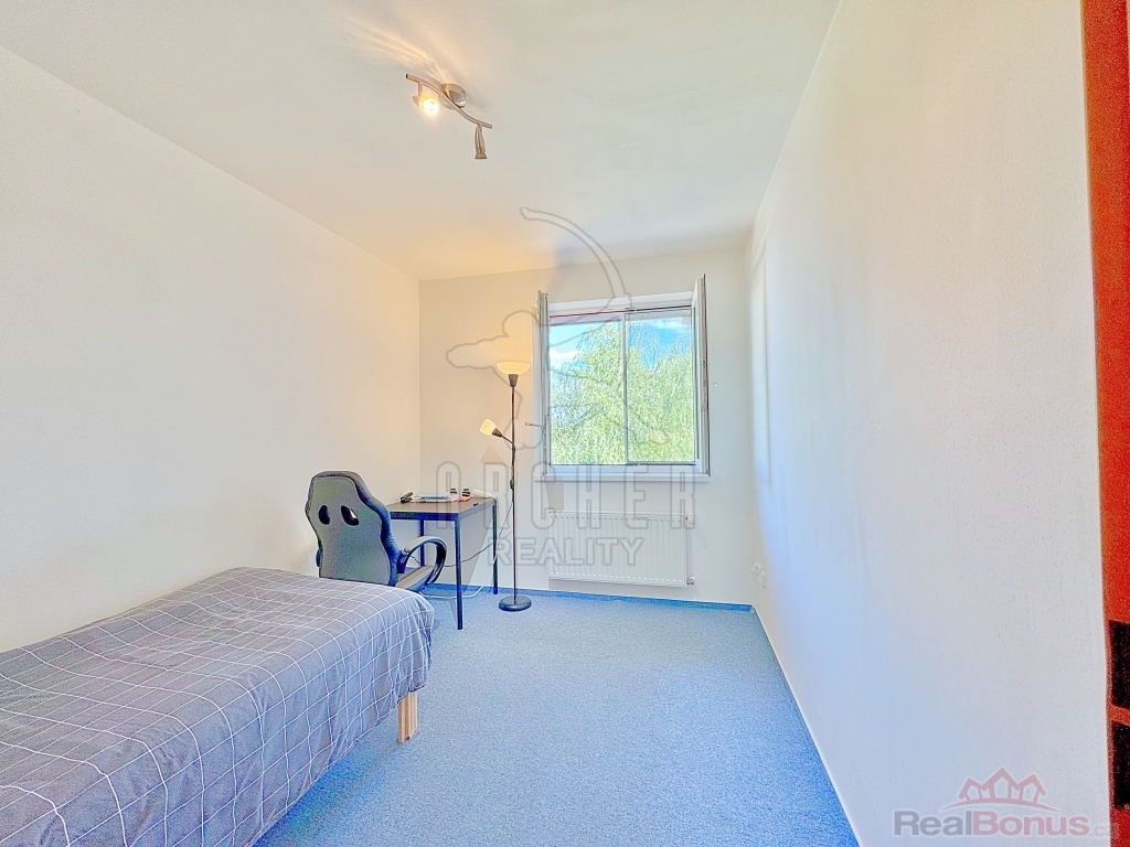 Ve 2. patře jsou tři světlé ložnice dvě s výhledem směrem nad centrum Nymburka, třetí orientovaná do zeleně. Dále je zde druhá koupelna vybavená rohovou vanou a toaletou.