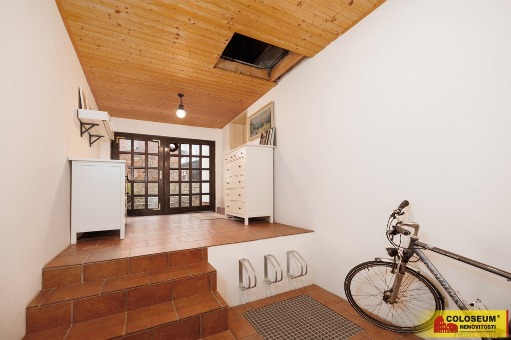 Dispozice domu je velmi praktická. Při vstupu do objektu se nachází průjezd, který slouží jako úložný prostor, jsou zde stojany na parkování kol a přístup na půdu. Průjezdem lze pohodlně projít až na dvorek.