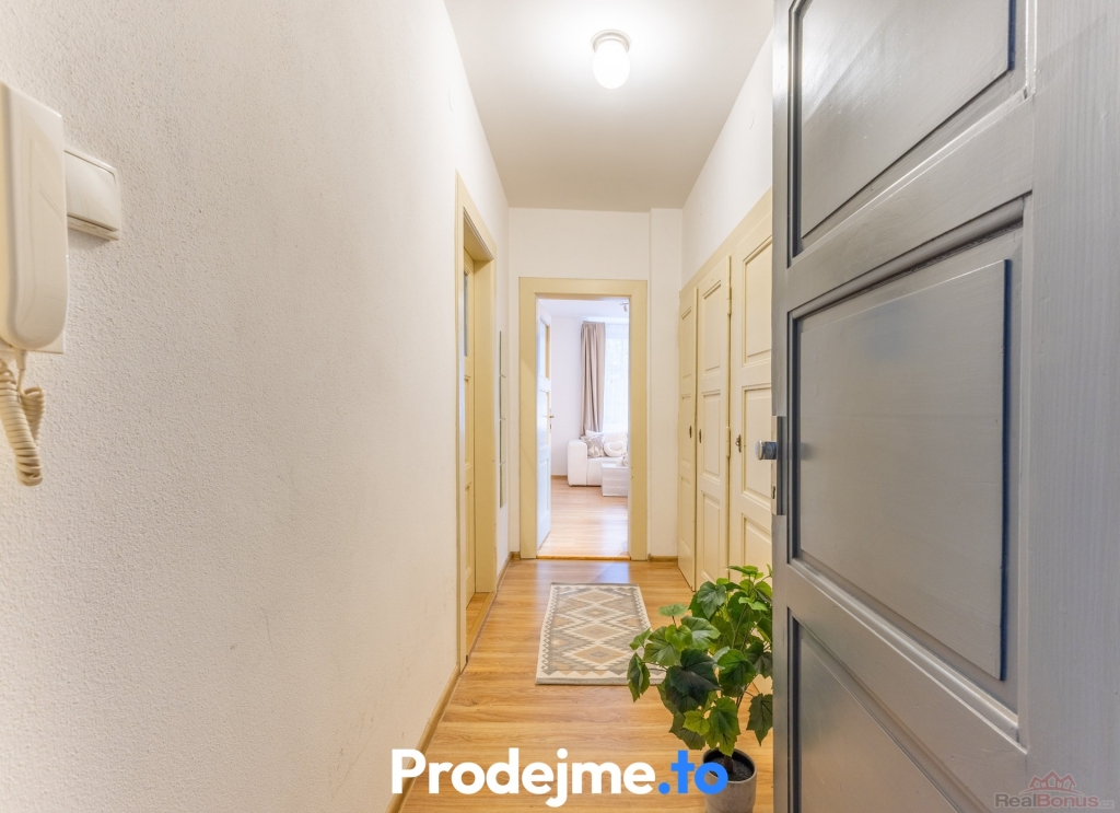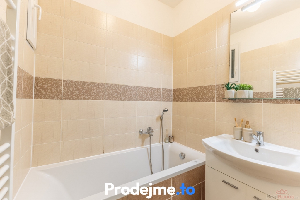 Byt tvoří kuchyně s moderní linkou a ostrůvkem, kterou lze využít i jako menší obývací prostor. Dále nabízí prostornou ložnici, samostatný pokoj, koupelnu s vanou, samostatnou toaletu a technickou místnost, kde je připravené připojení na pračku.