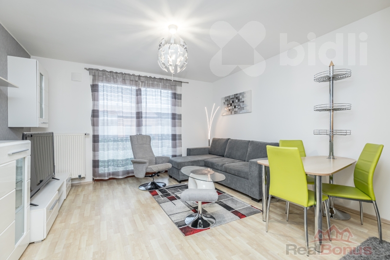 Prostorný a prosvětlený pokoj (obývací stěna)je propojen s kuchyňským koutem a kuchyňskou linkou (elektrická trouba, varná deska, digestoř) s dostatečným úložným prostorem a jídelním stolem.