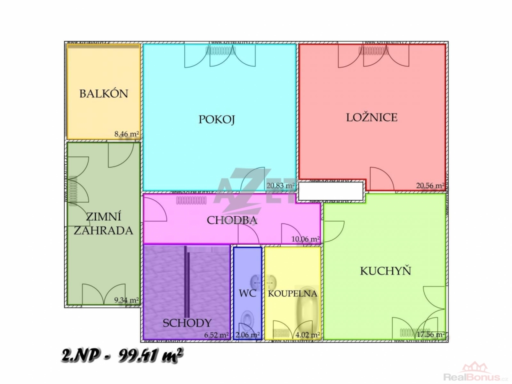 2.NP (99.41 m2) - chodba, vstup do podkroví, zimní zahrada, balkón, koupelna, WC, 3x obývací pokoje, popř. se dá realizovat z jednoho pokoje i kuchyně s jídelnou