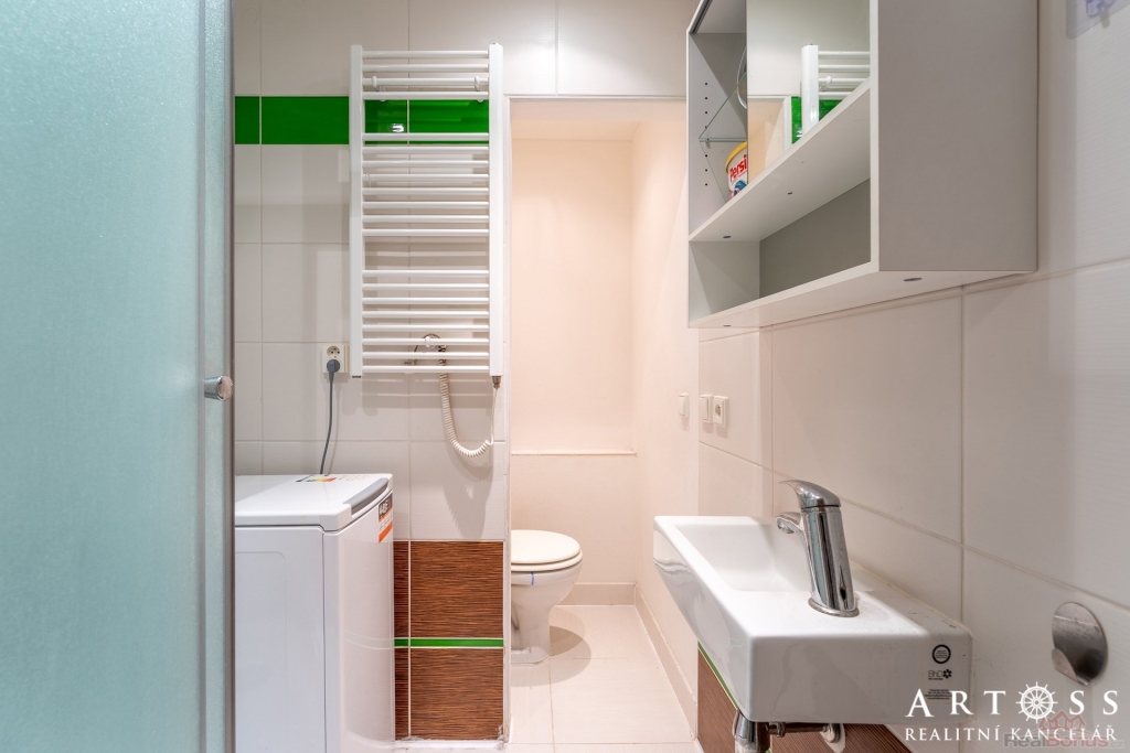 - Koupelna a WC po rekonstrukci - zděné jádro, sprchový kout, WC oddělené přepážkou, umyvadlo i pračka ? přesně to, co dnešní nájemník očekává.
