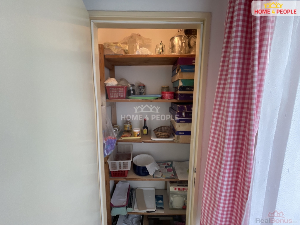 Dispozice bytu nabízí tři samostatné pokoje, kuchyni s komorou, koupelnu s vanou, samostatné WC a prostornou centrální halu, která poskytuje nadstandartní dostatek místa pro vestavěné úložné skříně, zde se nachází ještě další prostor, který lze využívat např. jako domácí kancelář či šatnu apod. K bytové jednotce dále náleží sklepní kóje umístěná v suterénu domu.