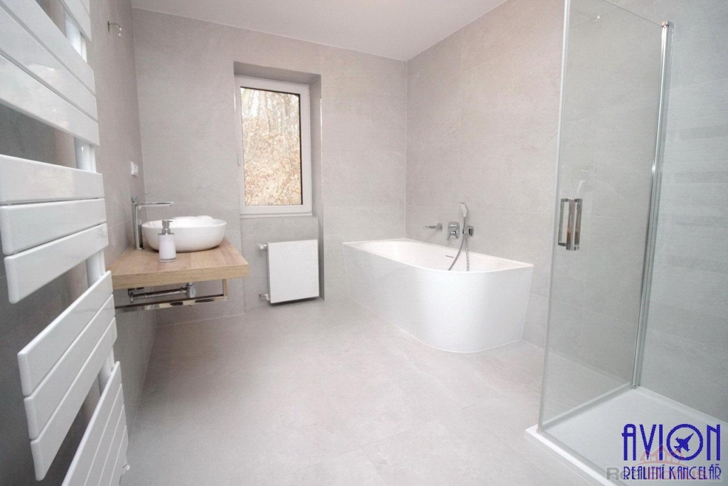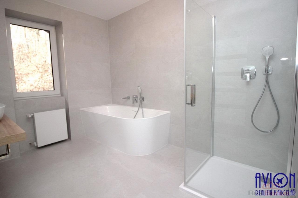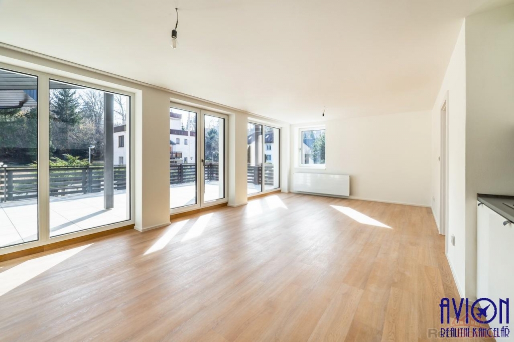 Ve všech pokojích bytu a na chodbách jsou vinylové podlahy, v obou koupelnách je dlažba. Zakázkové interiérové bezfalcové dveře s prosklením podtrhují moderní vzhled bytu. Nové rozvody elektřiny, vody a odpadů. Krásný slunný obývací pokoj 33 m2 se vstupem na prostornou terasu o výměře 31 m2 je na jihozápad, orientace ostatních pokojů o výměrách 10 až 17 m2 je na západ a severovýchod. Byt disponuje dvěma koupelnami, ve velké koupelně o výměře 7 m2 se nachází vana, sprchový kout a dvojumyvadlo, v další koupelně je sprchový kout a toaleta, další toaleta je samostatná.