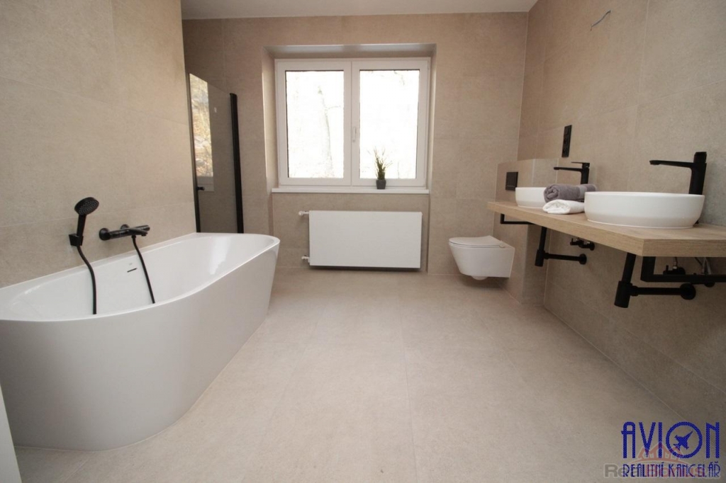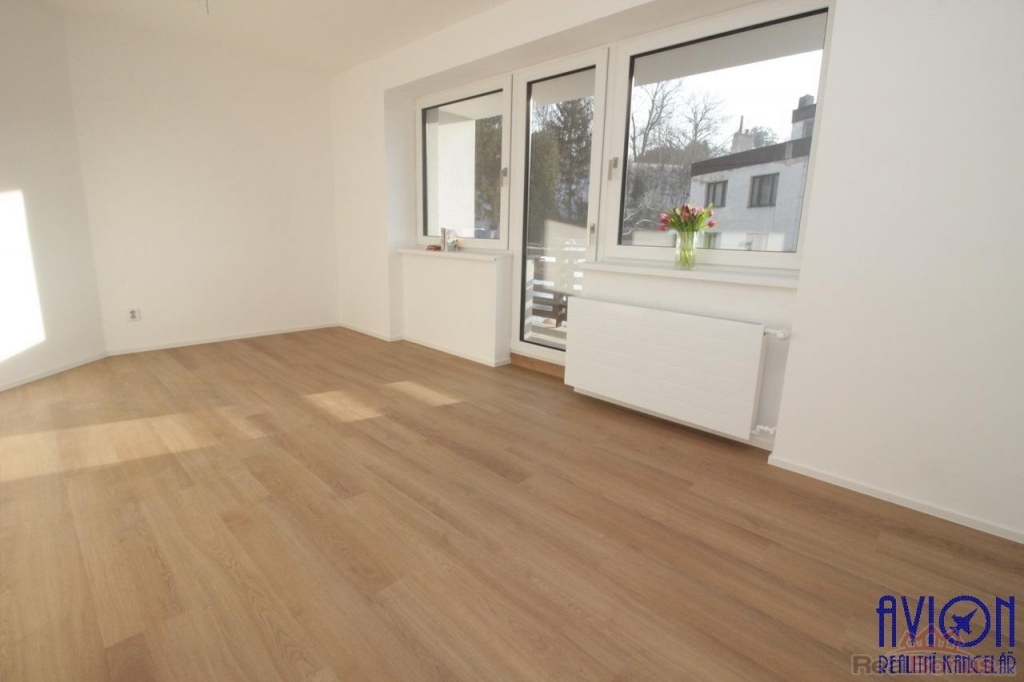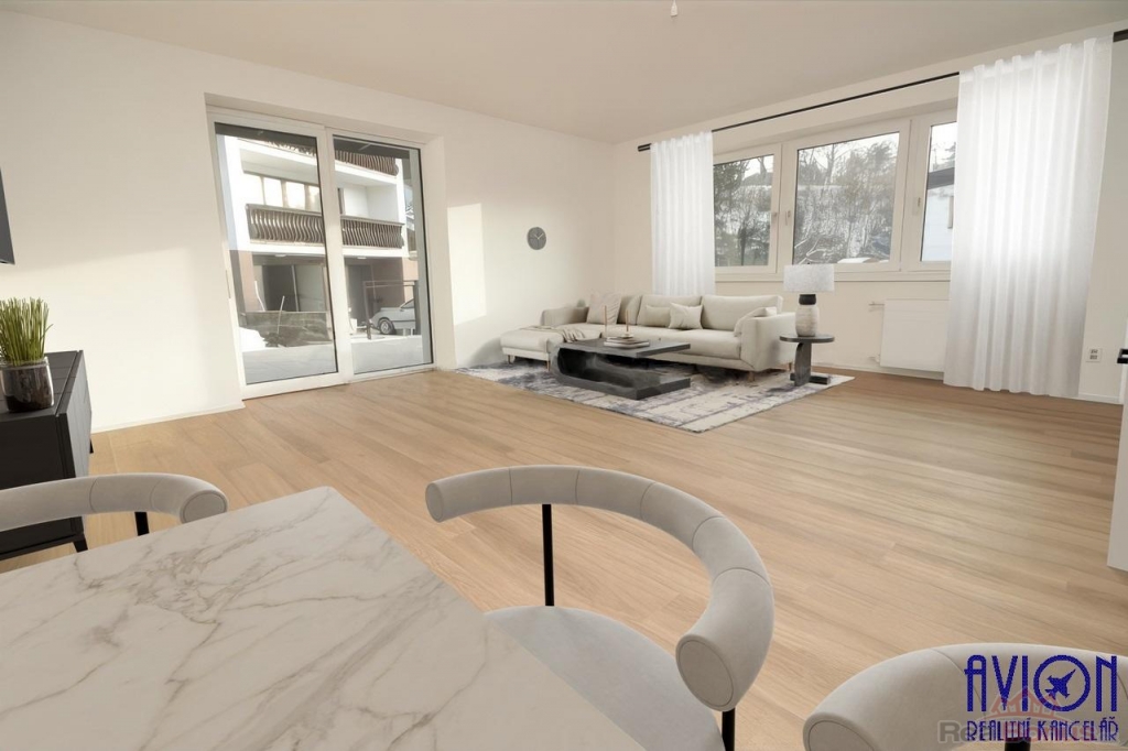 Ve všech pokojích bytu a na chodbách jsou vinylové podlahy, v koupelně a na toaletě je dlažba. Zakázkové interiérové bezfalcové dveře podtrhují moderní vzhled bytu. Nové rozvody elektřiny, vody a odpadů. Krásný slunný obývací pokoj 33 m2 se vstupem na terasu a dále na zahradu o výměře 100 m2 výlučně patřící k bytu. Oba další pokoje jsou slunné a prostorné (17 a 18 m2) s orientací oken na jihozápad a jihovýchod. Byt disponuje velkou koupelnou s oknem o výměře 11 m2, kde najdete vanu, sprchový kout, dvě designová umyvadla a WC, další WC je samostatné. Přímo v bytě je komora 2 m2.
