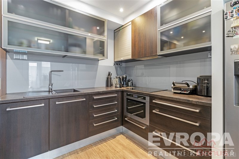 Byt je plně vybavený nábytkem i spotřebiči k dispozici je americká lednice, myčka nádobí, trouba, varná deska a úložné prostory v podobě vestavěných skříní na míru v předsíni i ložnici. Díky tomu je byt ihned připraven k pohodlnému bydlení bez dalších investic.