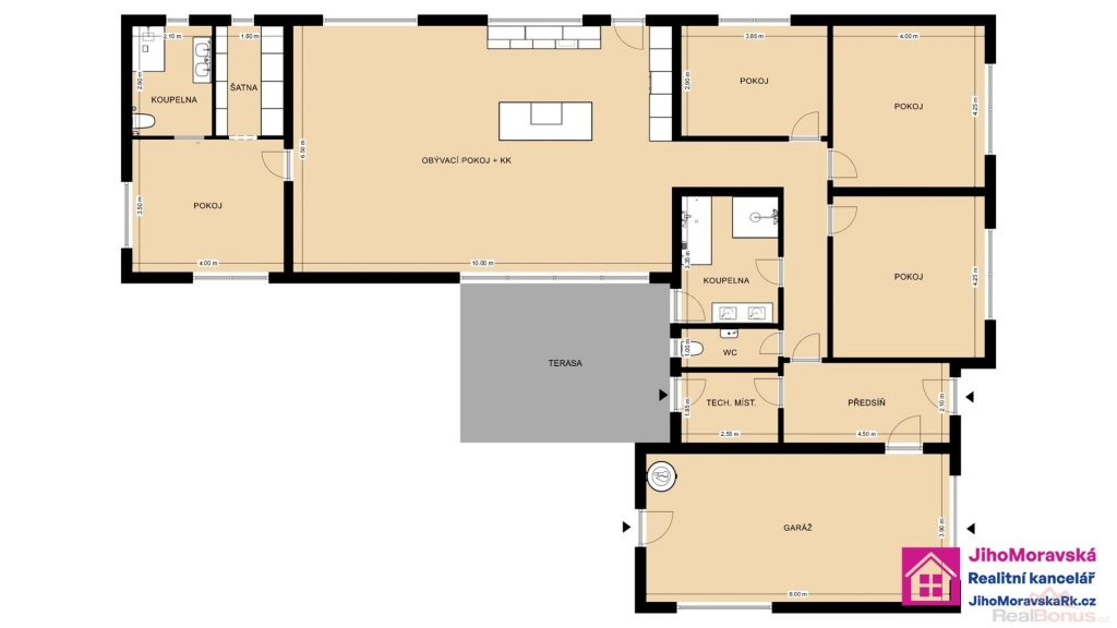 Dispozice domu: garáž, předsíň, chodba, technická místnost, toaleta, koupelna (vana i sprchový kout), tři neprůchozí pokoje, obývací pokoj s kuchyňským koutem, pokoj, koupelna (sprchový kout a toaleta) a šatna. Půdorys domu naleznete ve fotogalerii.
