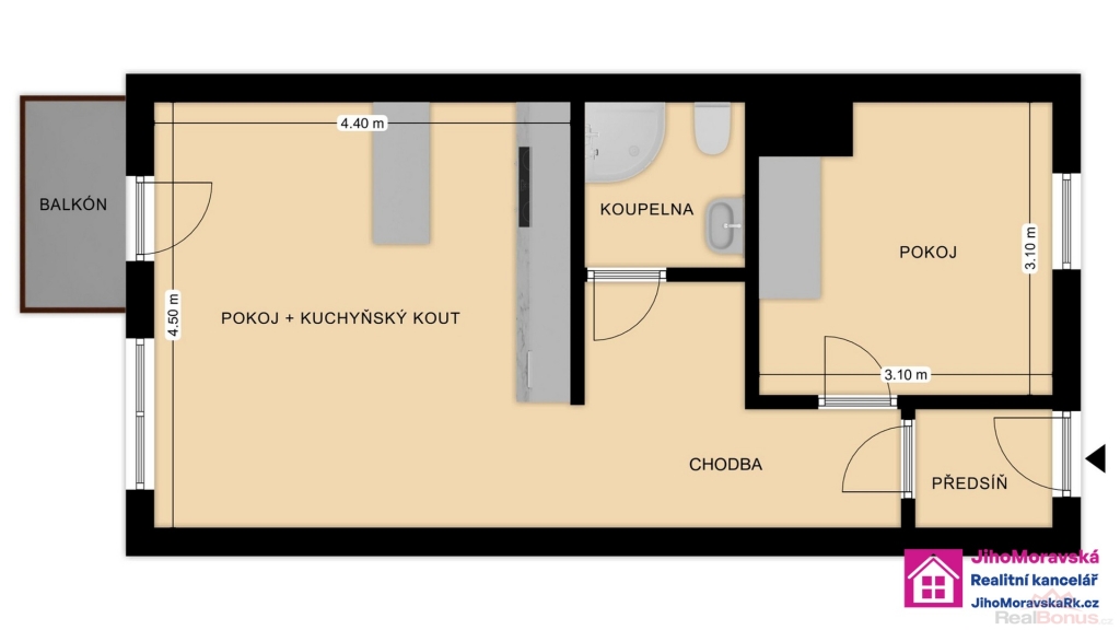 Dispozice bytu: předsíň, chodba, pokoj, koupelna s toaletou (sprchový kout), pokoj s kuchyňským koutem a balkón. Půdorys bytu naleznete ve fotogalerii.
