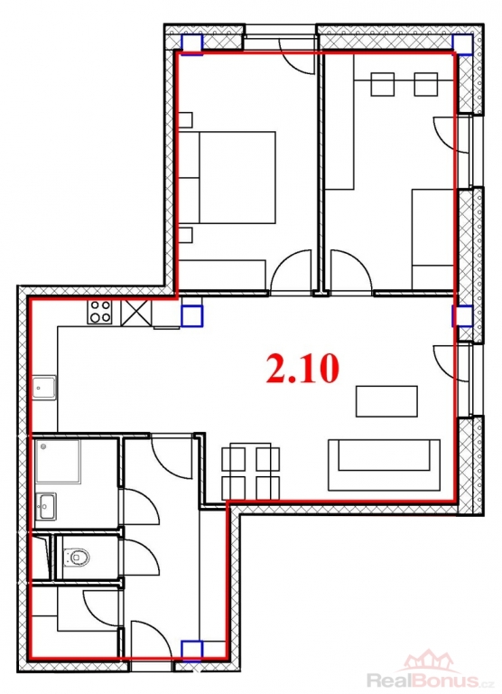 Dispozice: vstupní chodba (8,2 m2), pokoj s kuchyňským koutem (29,7 m2), pokoj (13,5 m2), pokoj (12,6 m2), koupelna (4,4 m2), WC (2,7 m2), komora (2,4 m2)