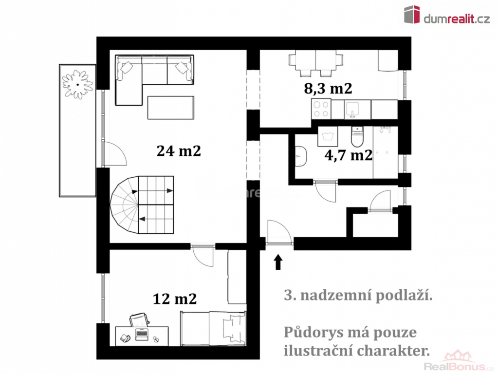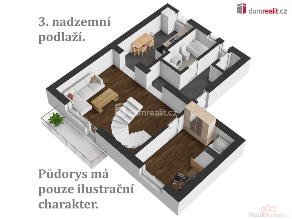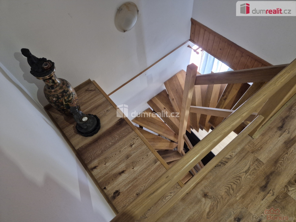 Základ bytu po kompletní rekonstrukci tvoří obvyklé 2+1 o cca 60 m, s novou koupelnou a kuchyňskou linkou, kde je v obýváku s přístupen na balkon instalováno schodiště do vestavěného podkroví o cca 100 m, se třemi pokoji, komorou, koupelnou se sprchovým koutem, umyvadlem a WC.