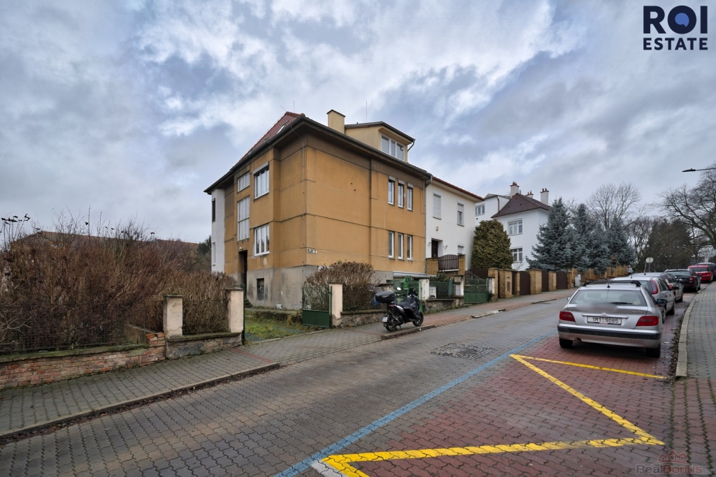 Nenápadný dům v klidné ulici, jen čtyři byty, zahrada a park za rohem. Uvnitř pak překvapivě prostorný byt 4+kk po rekonstrukci, který dává smysl dispozičně i atmosférou.
