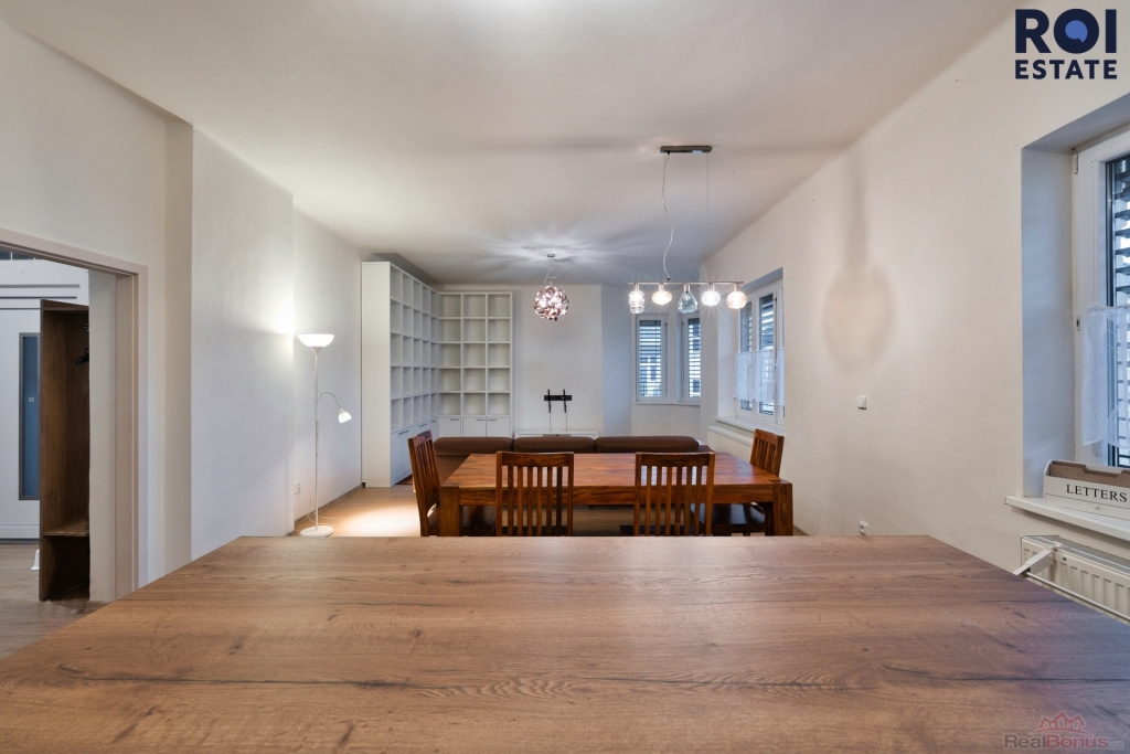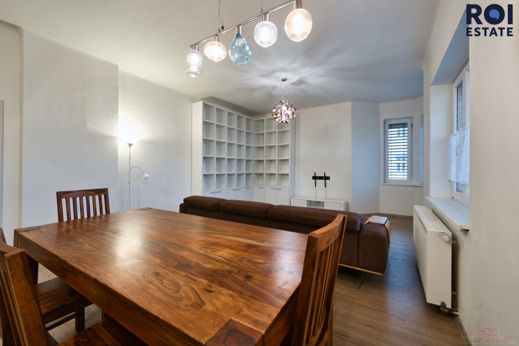 Hlavním obytným prostorem je obývací pokoj propojený s jídelnou a kuchyňskou linkou. Je otevřený, světlý a přirozeně vybízí ke společnému trávení času. Byt je částečně zařízený, takže nabízí praktický základ, ale zároveň prostor přizpůsobit si bydlení podle vlastních představ.