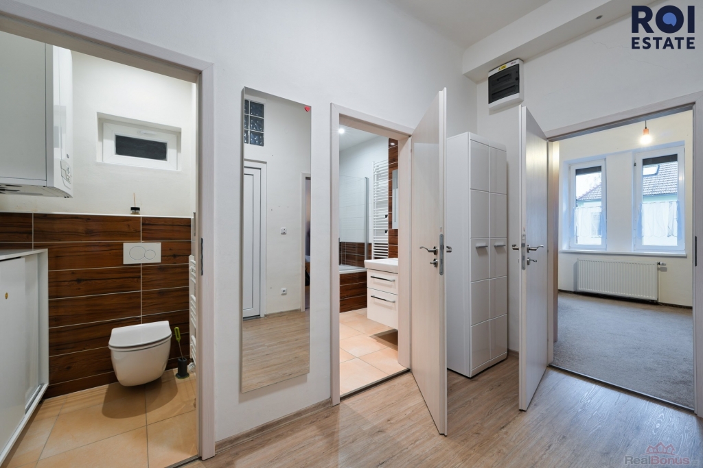 Koupelna je vybavená vanou, toaleta je oddělená, což je praktické a komfortní řešení. Rekonstrukce je na bytě znát. Působí čistě, klidně a je připravený k okamžitému nastěhování.