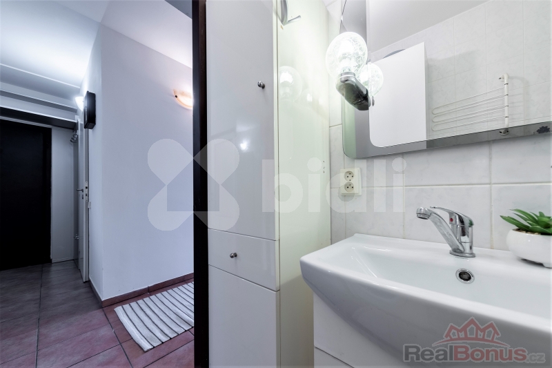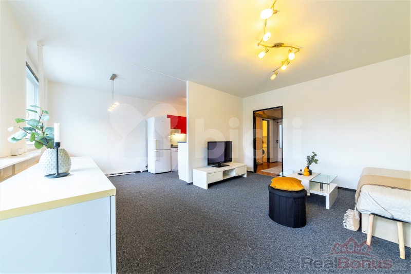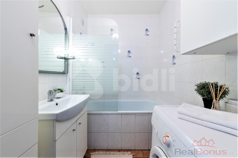 K dispozici je samostatná toaleta a koupelna s vanou a sprchovou clonou, kde je dostatek místa i pro pračku se sušičkou. Dominantou bytu je světlý obývací pokoj s kuchyňským koutem, prakticky a vkusně řešený. Z obývací části je vstup na lodžii, ideální pro ranní kávu nebo večerní relax.