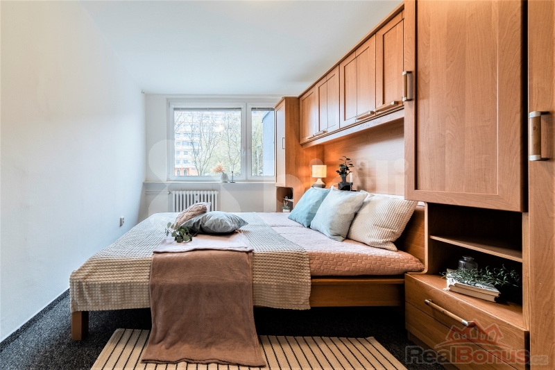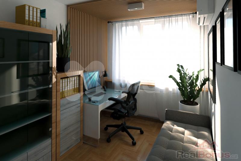 Byt nabízí dva neprůchozí pokoje o velikosti cca 13 m², orientované do klidnější části domu. Jeden slouží jako ložnice (nábytek může zůstat), druhý jako dětský pokoj nebo pracovna, přičemž je k dispozici vizualizace možného budoucího využití.