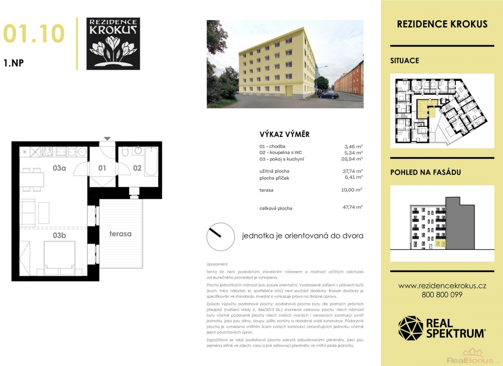 Dispozice bytu: vstupní chodba (3,46 m2), obývací pokoj s kuchyňským koutem (28,94 m2), koupelna s WC (5,34 m2), terasa (10,00m2)
