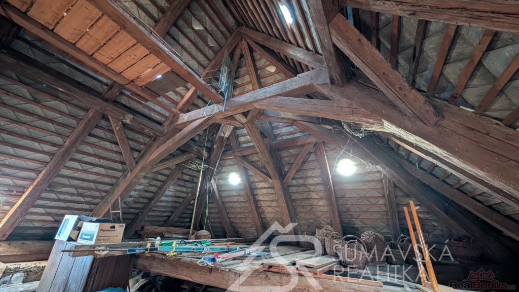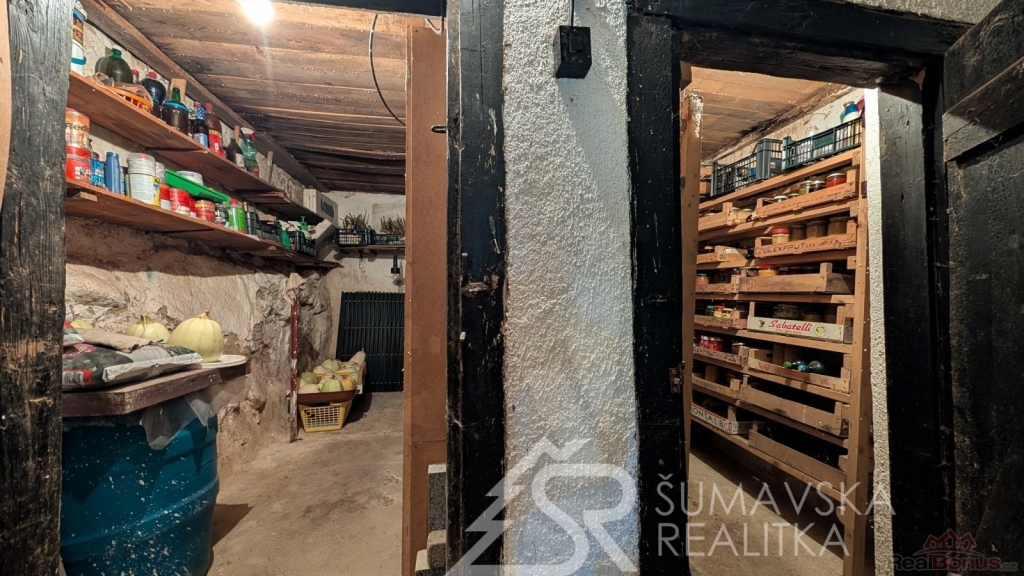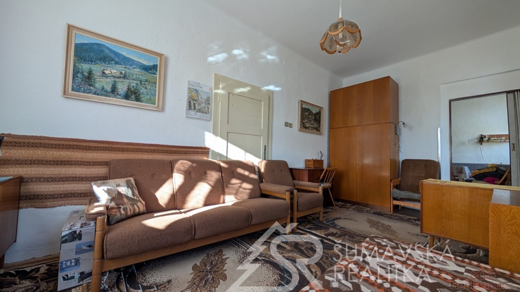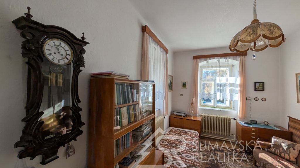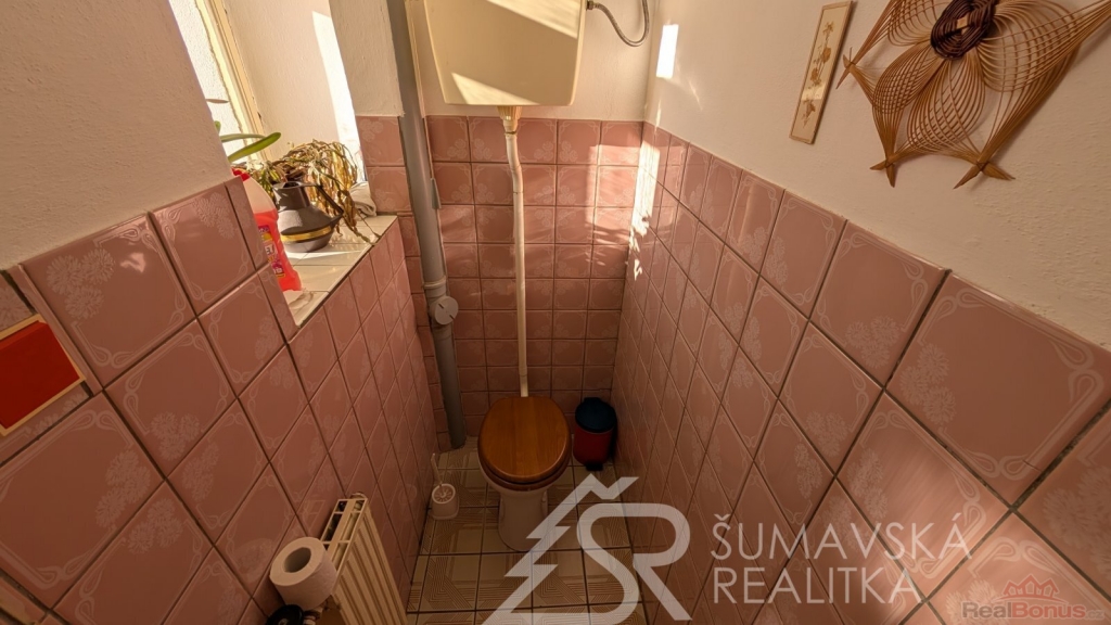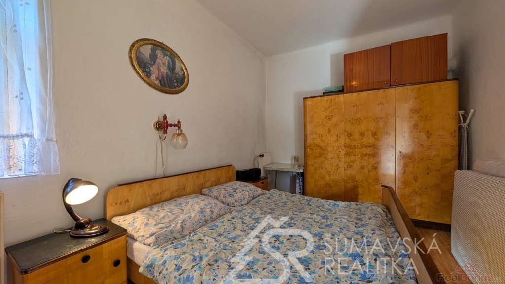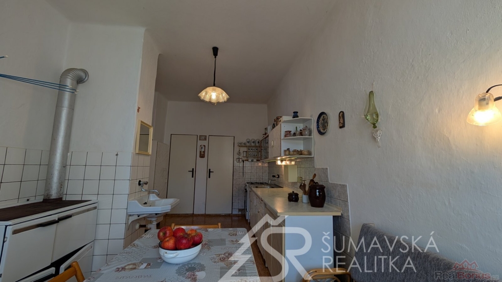 Vnitřní dispozice: Ze zápraží se vstupuje do předsíně, kde vlevo se nachází samostatné WC, ložnice, vstup na prostornou a zatím nevyužívanou půdu. Srdcem domu je kuchyně s kamny na tuhá paliva, komorou a nově vybudovanou koupelnou (cca před 18 lety). Z kuchyně je vstup do obývacího pokoje, který nabízí přímý vstup na terasu s kouzelným výhledem na šumavské kopce.