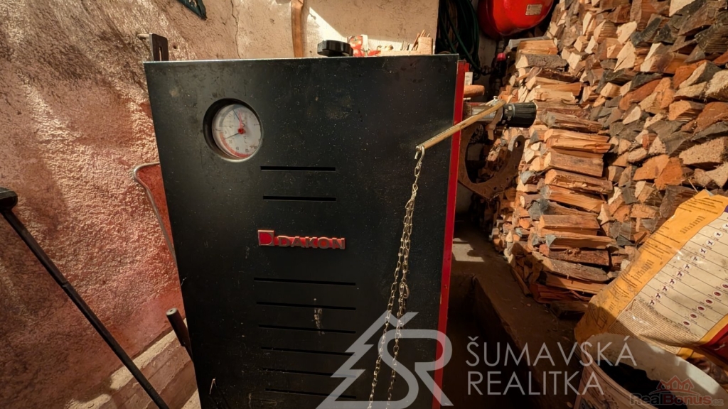 Topení: kotel na tuhá paliva v samostatné kotelně + kamna v kuchyni na tuhá paliva