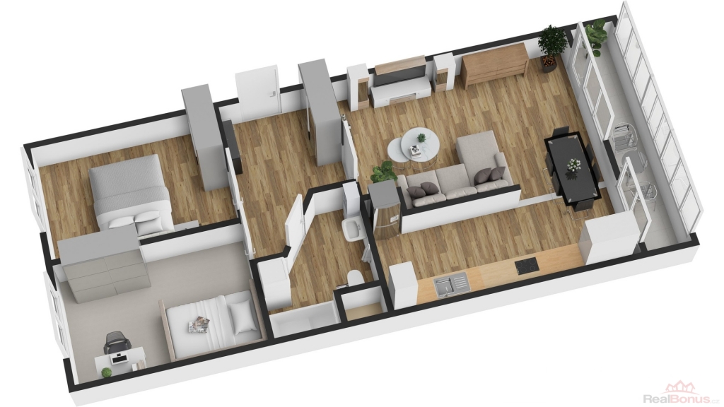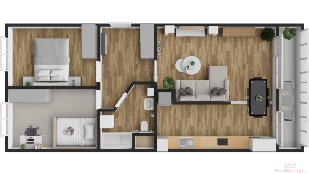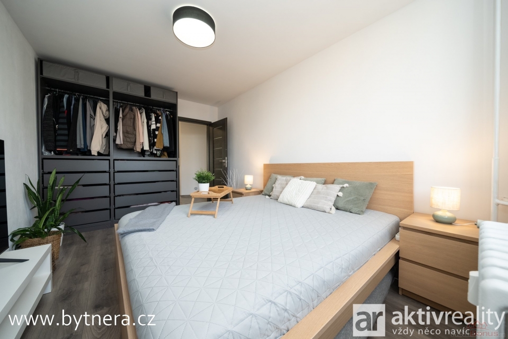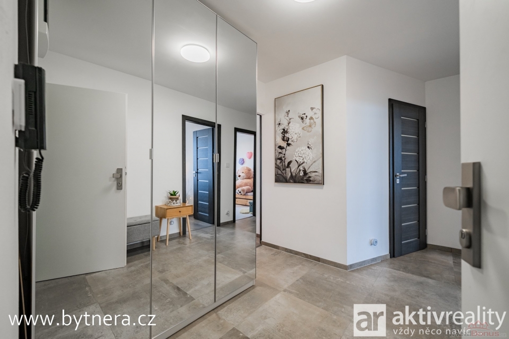 Disponuje světlým obývacím pokojem s jídelním koutem a vstupem na zasklenou lodžii. Kuchyně je vybavena novou moderní kuchyňskou linkou se zabudovanými spotřebiči a nabízí dvě praktické špajzy. K dispozici jsou dále dva samostatné pokoje ? ložnice a dětský pokoj ? s příjemným výhledem do okolí. Prostorná moderní koupelna je vybavena vanou a přípojkou na pračku, přičemž zde zůstal dostatek místa i pro sušičku.