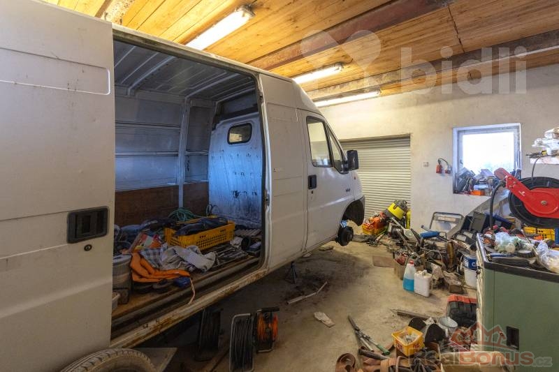 -- velká garáž s dílnou (cca 50 m2) - vjezd i pro vysokou dodávku,