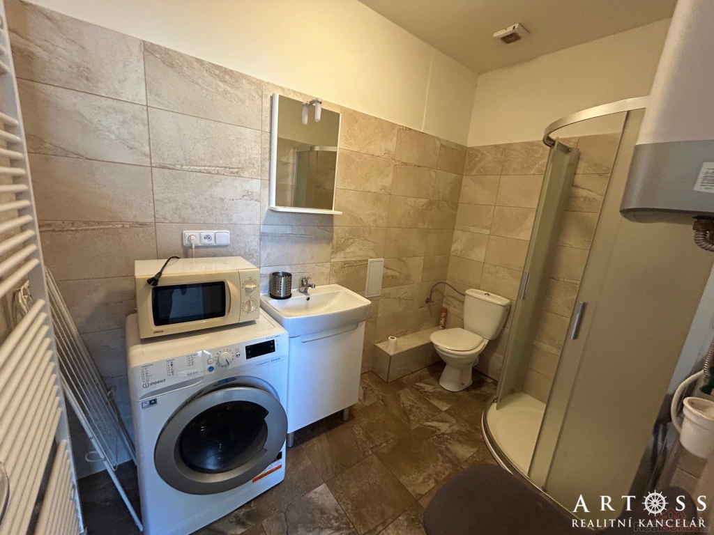 Veškeré stávající vybavení nájemníkům zůstává k dispozici - kuchyňská linka včetně sporáku a trouby, mikrovlnná trouba, digestoř, klimatizace, automatická pračka.