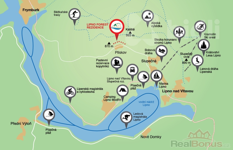 Okolí láká k aktivitám po celý rok - v létě koupání, jachting, cykloturistiku a rybaření, v zimě lyžování ve skiareálech Kramolín, Sternstein a Hochficht, bruslení na zamrzlém Lipně či běžkařské tratě v okolí. Lipno Forest Rezidence je projekt zasazený citlivě do krajiny - s kamennými zídkami z místní skály a zahradami osázenými vřesy. Nabízí nejen výjimečné bydlení, ale i investiční příležitost v jedné z nejžádanějších lokalit jižních Čech.