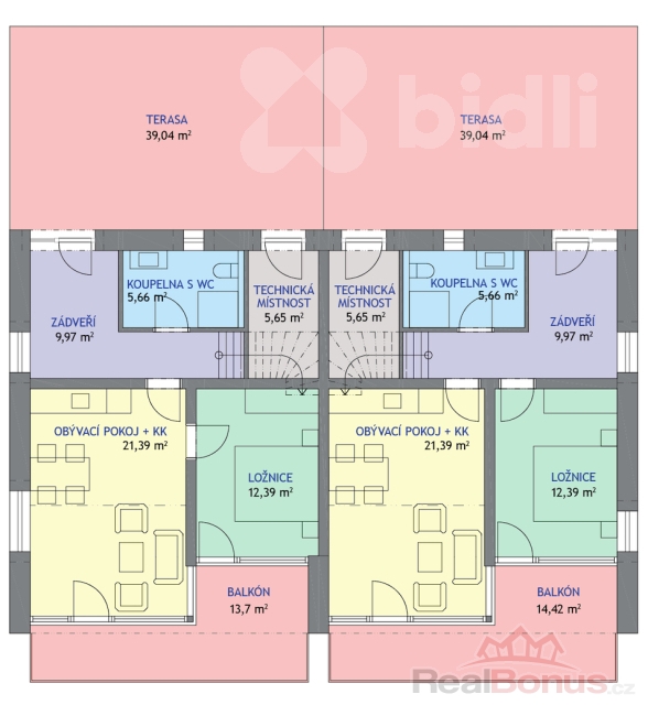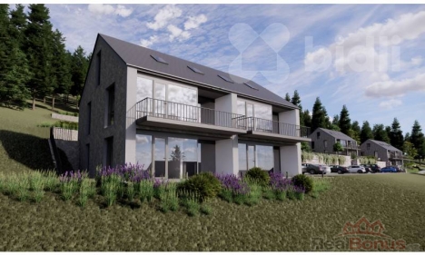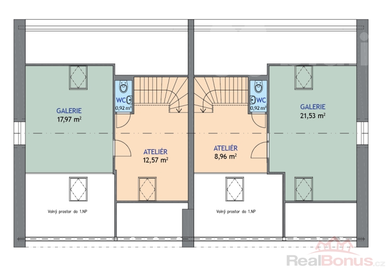 V horní části domu (1. NP a podkroví) jsou situovány dva samostatné mezonetové byty, z nichž každý má plochu cca 130 m2 včetně balkonu a teras.