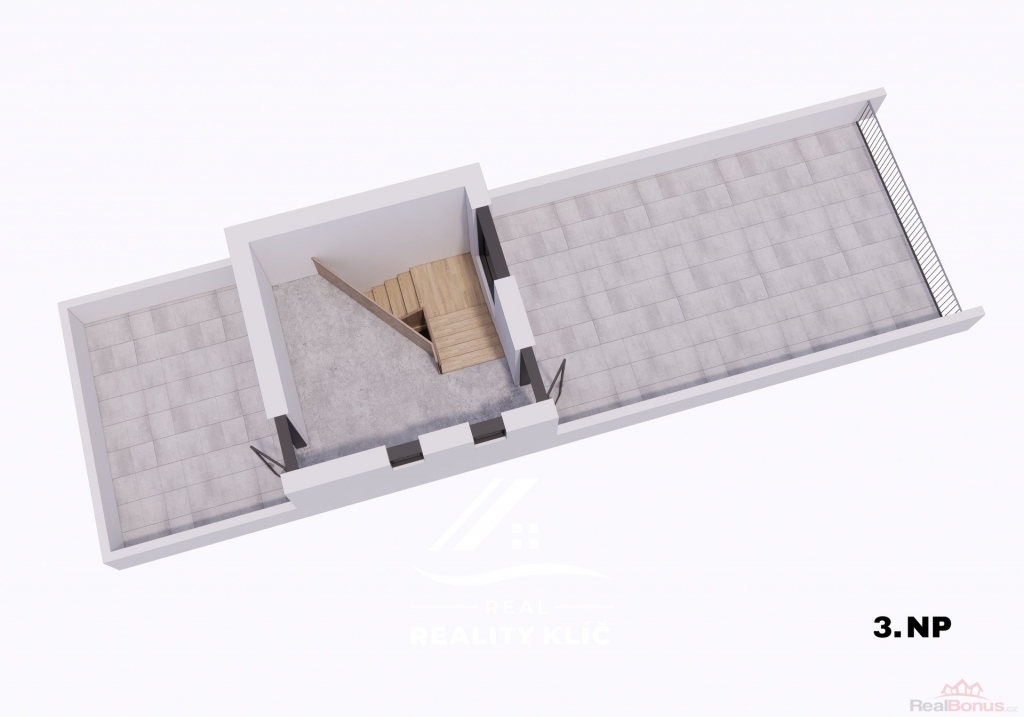 Třetí nadzemní podlaží přístavby nabízí vstup na prostornou střešní terasu s výhledem do okolní krajiny. Terasa dodává budově další využitelnou plochu vhodnou pro venkovní posezení, menší akce, relaxaci nebo doplnění zeleně.