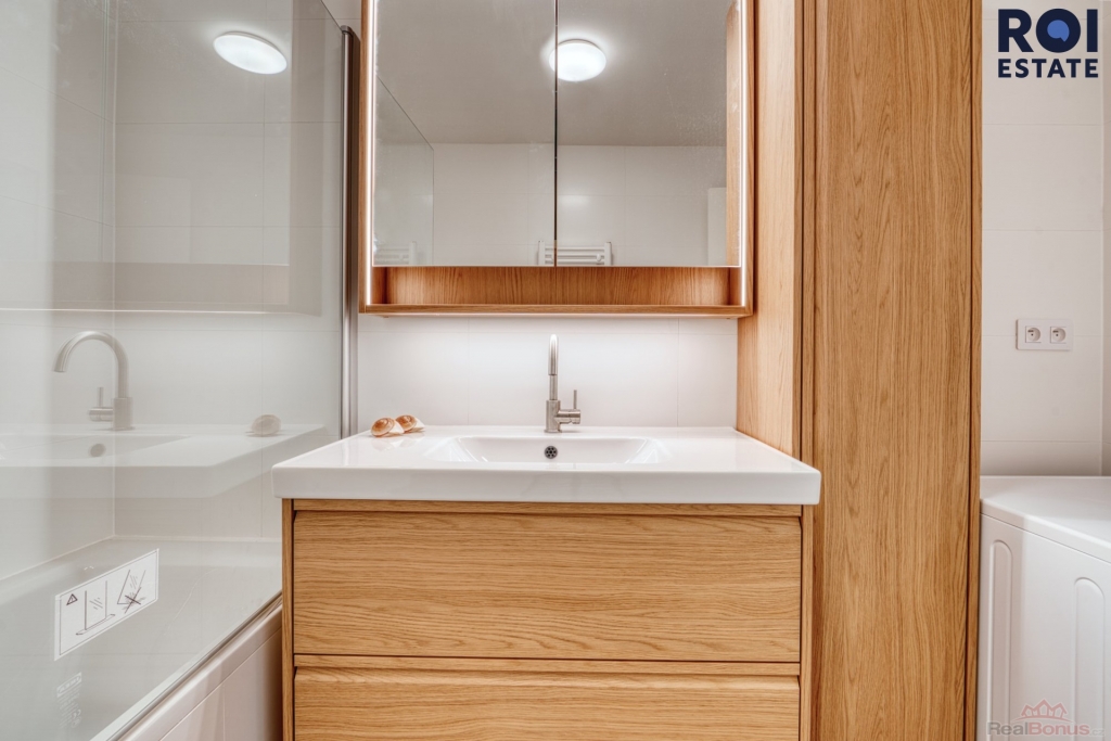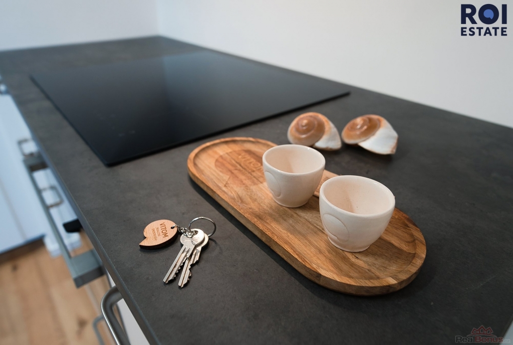 Byt působí světlým, vzdušným a elegantním dojmem. Dominantou je obývací pokoj s kuchyňským koutem a přímým vstupem na terasu, která nabízí ideální místo pro ranní kávu, večerní sklenku vína i obyčejný odpočinek po práci.