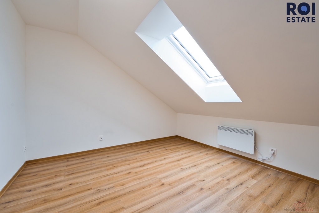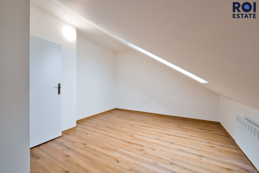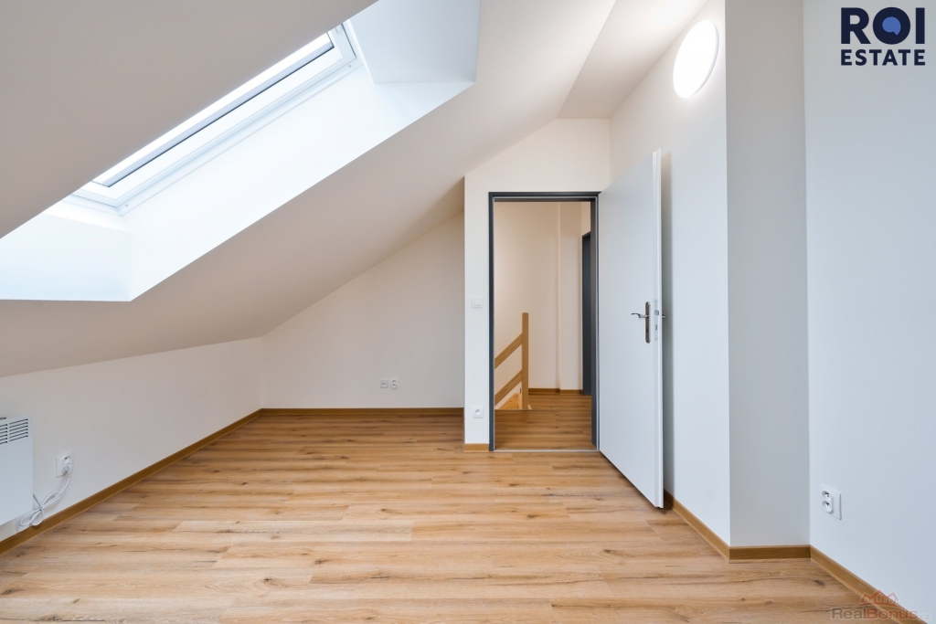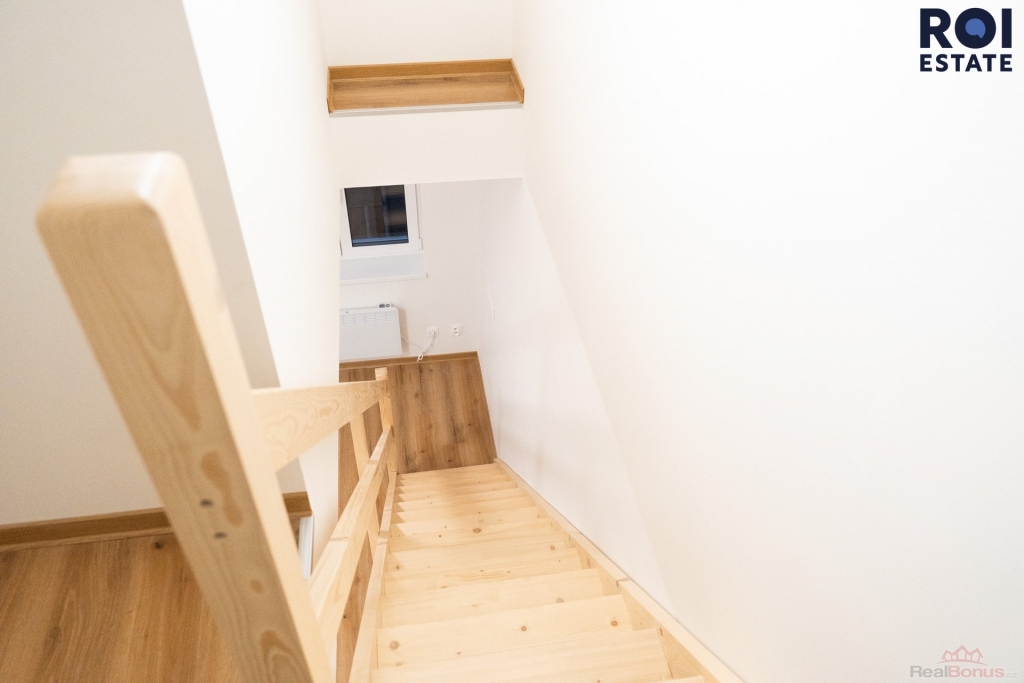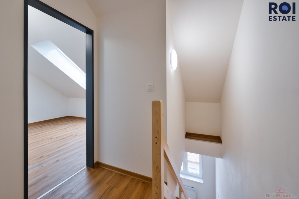 Po dřevěných schodech vystoupáte do horní části bytu, kde se nacházejí další dvě samostatné podkrovní ložnice.